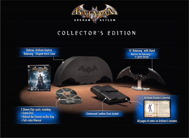 Just as cool as the games themselves, though, are the “collector’s edition” sets! Arkham Asylum came with a life-sized batarang replica which could be displayed on its own custom stand.