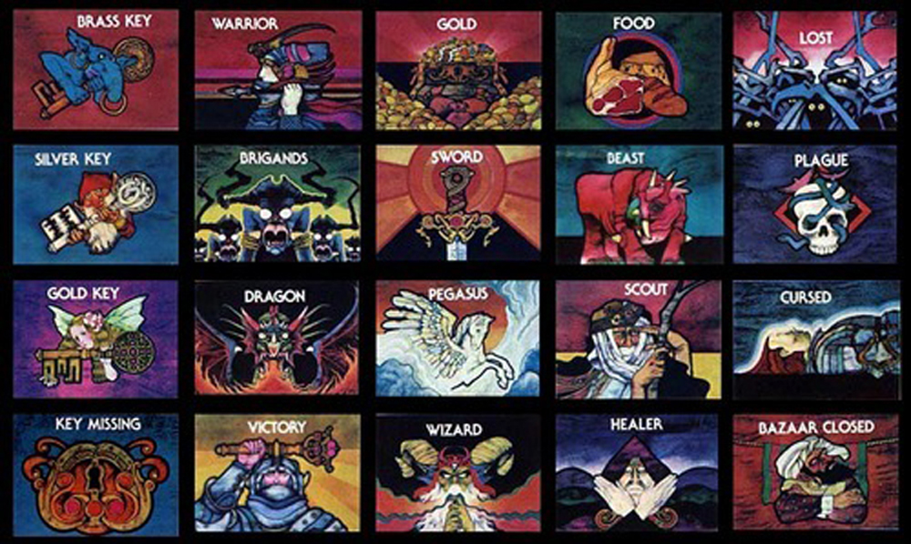 With the Tower as your game master, you press buttons on it to enter where you are in your quest. Along the way, you could shop and try to haggle in the bazaar, become lost (but if you’d bought the services of a scout, this would not affect you), curse another or become cursed, or get hit with a plague (but if you’d bought the services of a healer, this would not affect you). You could explore crypts, encounter a dragon (but if you’d located the Dragonsword, you earned its haul), or find a pegasus (who could somehow transport your entourage, regardless of its size).