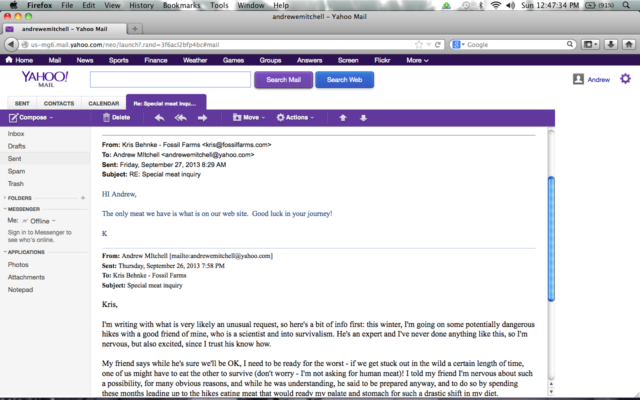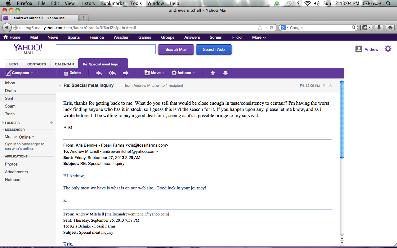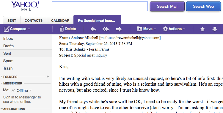 While thinking about cannibalism, I wondered what a person might eat to work their way up (or down, depending on how you look at it) to such a practice. I hit upon the answer, which is revealed below, in an email I sent to Fossil Farms, seller of various exotic meats. As Andrew Mitchell, I wrote (click to enlarge):