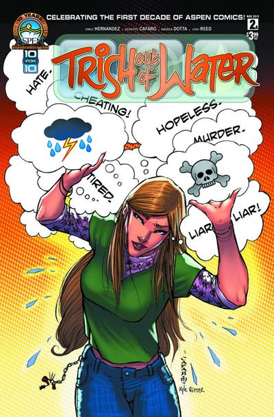 “What would you do if your life was turned upside down– before it even really started? After the shocking and life-altering discovery in her home and the subsequent reveal that her boyfriend was cheating on her behind her back, Trish quickly realized that her life will never truly be the same. However, the discovery that she may be something altogether more amazing will lead to even further questions than she could have ever imagined-including who is now out to kill her! Aspen’s own Vince Hernandez is joined by the artistic talents of Giuseppe Cafaro and Andrea Dotta to bring to you Aspen’s newest hit series, TRISH OUT OF WATER!”