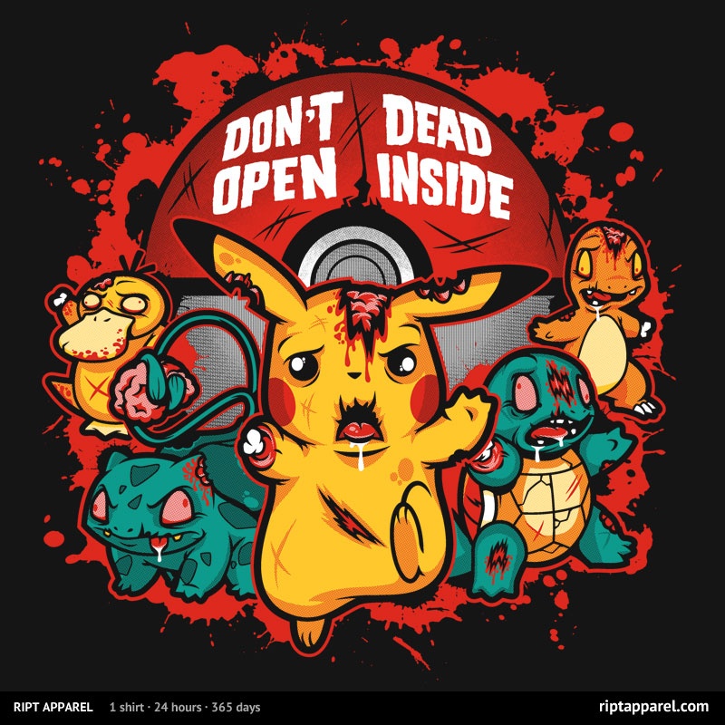 Ript Apparel has a pair of Pokémon shirts as well. The first might be propaganda to keep us from feeling bad for storing our Pokémon in tiny pokéballs, and the second gives us a classic warning against zombie Pokémon: Don’t Dead, Open Inside.