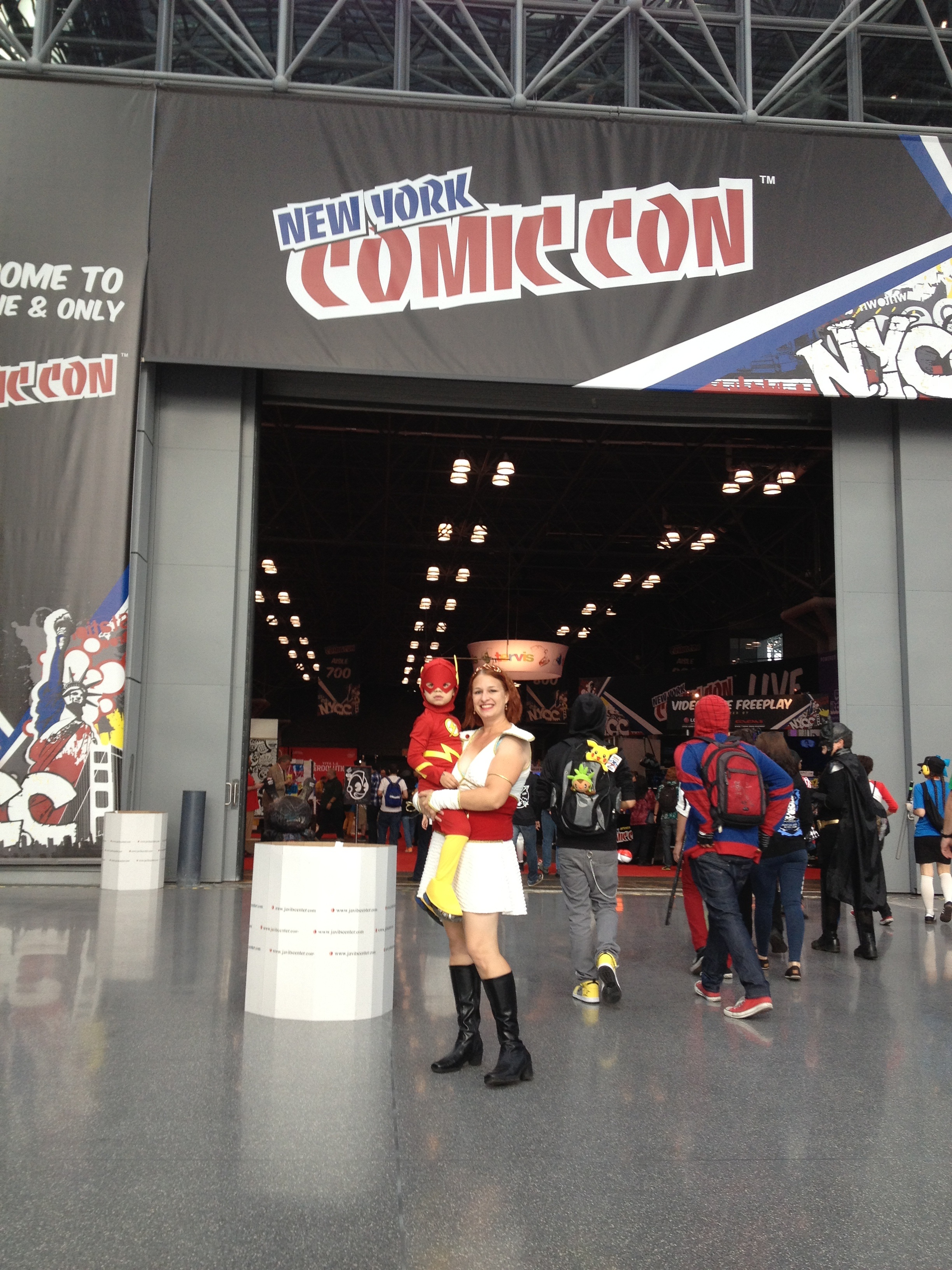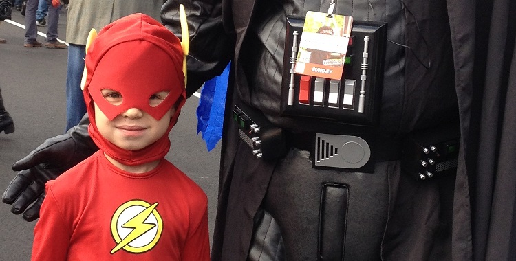 The Princeling and I dressed in costumes, me as Codex from The Guild because Felicia Day was going to be at Comic Con, and my child as The Flash because he’s obsessed with running fast.* My husband did not dress in costume because he is too stoic and boring for that sort of thing, though I made him wear his Darth Vader “World’s Greatest Dad” t-shirt so he wouldn’t embarrass me.