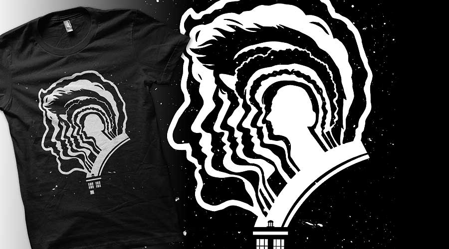 Tee Fury has a pair of Doctor Who shirts featuring all of the Doctor’s regenerations.