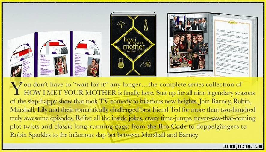 You can OFFICIALLY have it September 23rd, BUT YOU CAN PRE-ORDER IT NOW BY CLICKING HERE! (P.S. If you order by first going through our link, you pay the same AND help support Nerdy Minds, so thanks for that!) Want to receive it the day it comes out? Order now and select 2-day shipping! (Alternatively, if you already have every season and don’t care about the hella’cool packaging, you can order HIMYM Season 9–also available September 23rd–by clicking here.) We say it’s the perfect item to start your holiday shopping with! I mean, come on, you’re going to buy it anyway… This way you can buy it for “your husband” or “your mom” or “your roommate” (anyone you live with)…because of course part of that gift will be the “quality time” you’ll spend “together” watching it. (Gosh, I really hope MY husband doesn’t read this as I’ve just incriminated myself for what I’ve been doing the last 5 years…)