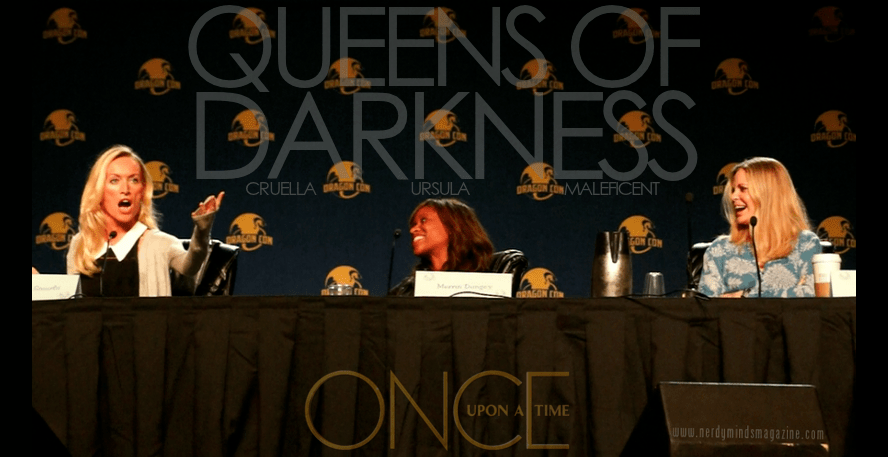 If you were among the lucky ones at Dragon Con, you got to experience this live! Disappointed you missed it? We’ve got you covered! We are pleased to present to you the Queens of Darkness, the bad girls of Once Upon a Time: Merrin Dungey (Alias) as Ursula, Victoria Smurfit (Dracula) as Cruella, and Kristin Bauer van Straten (True Blood) as Maleficent… and what good bad girls they are!
