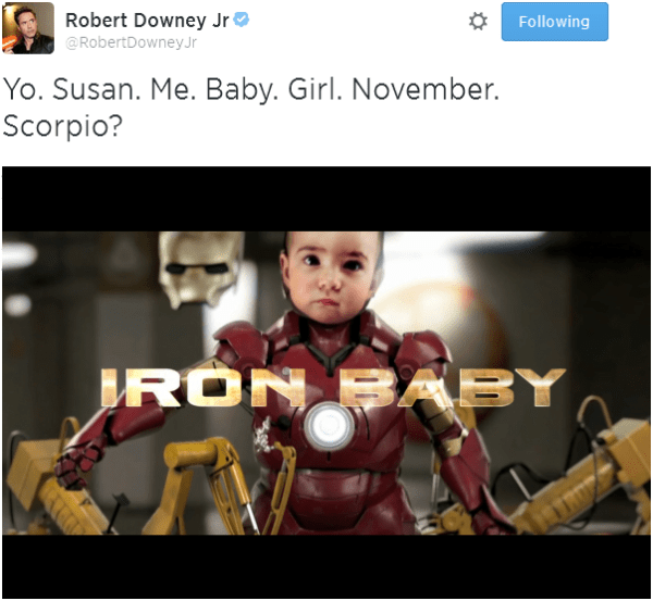 Exciting news from Robert Downey Jr (Iron Man, The Avengers): a baby's on the way!!! A picture's worth a thousand words...which is good because RDJ was a man of few words in his announcement. Congratulations to the Downey clan!!! ...and for added enjoyment, the IRON BABY trailer by Patrick Boivin! -- Stay tuned to Nerdy Minds Magazine... Continue Reading →